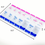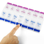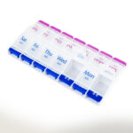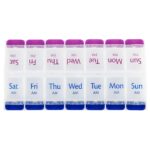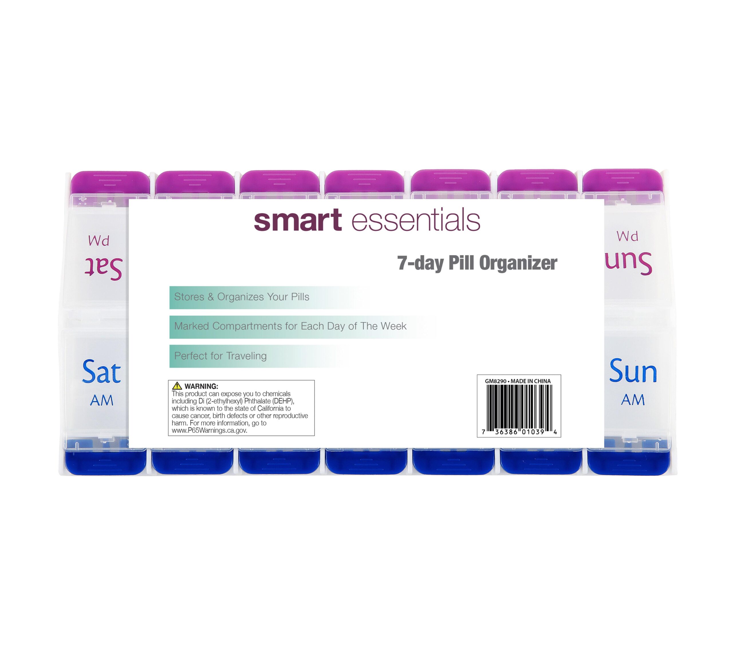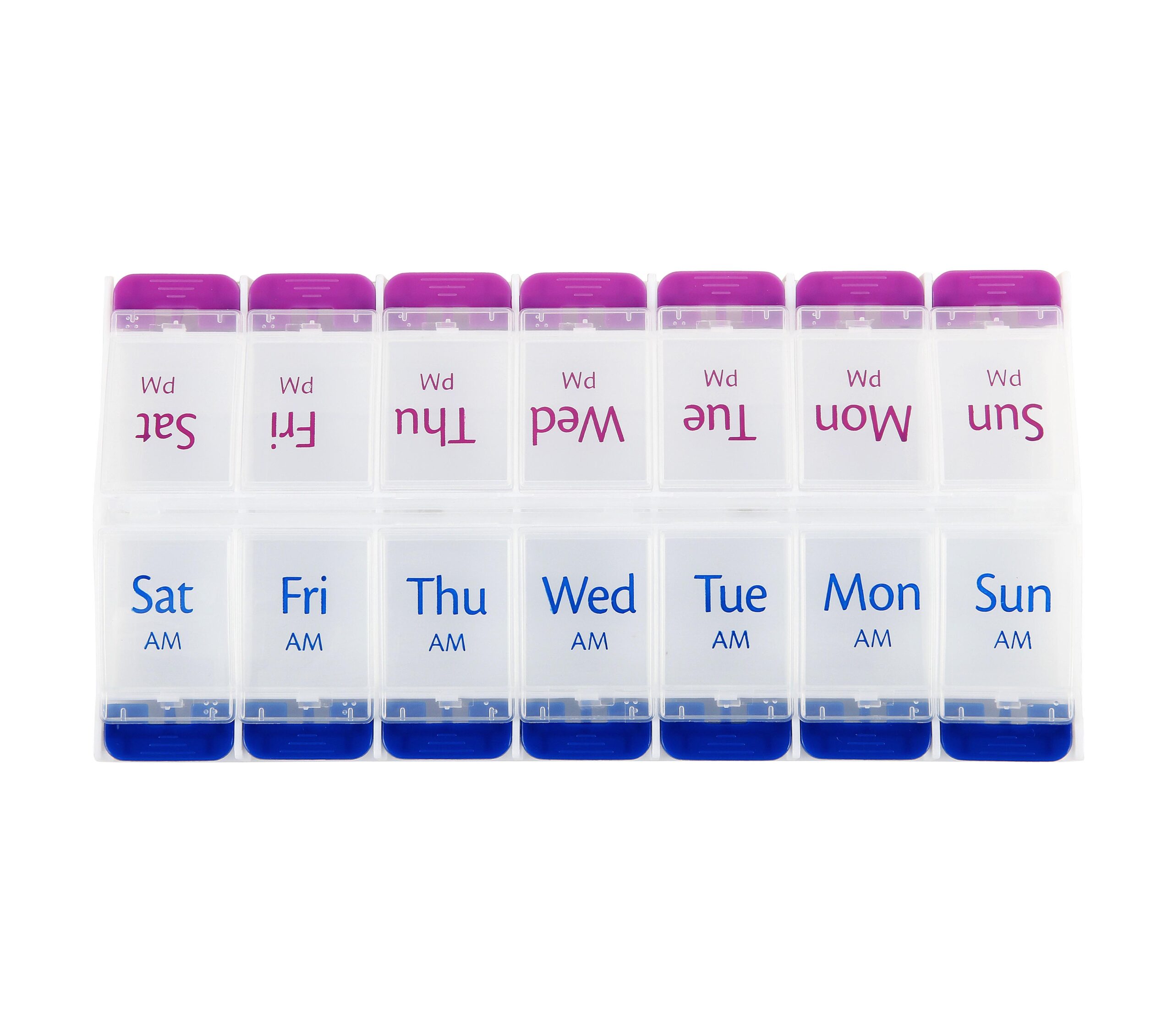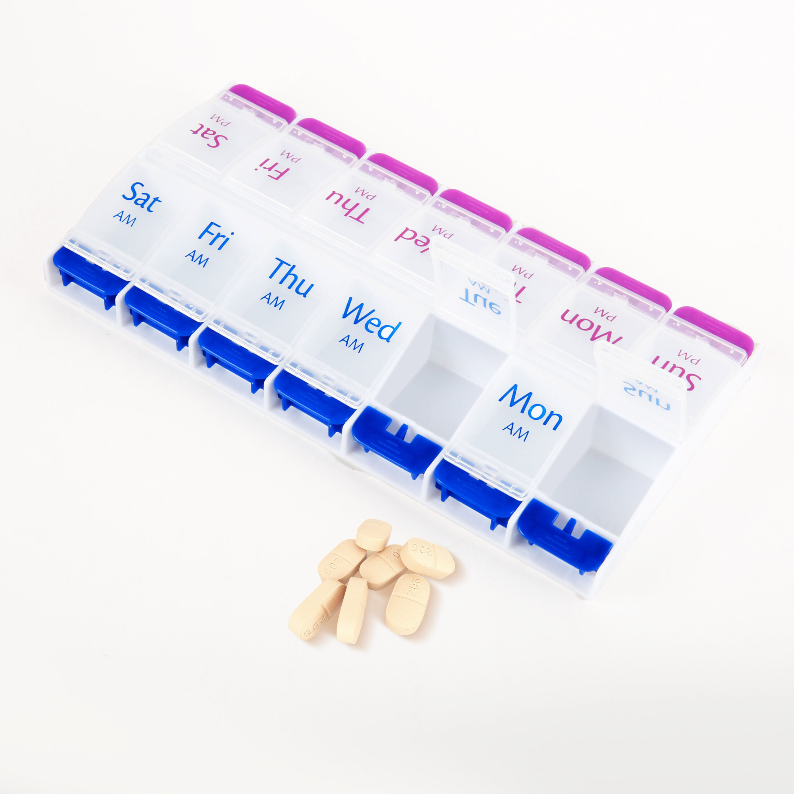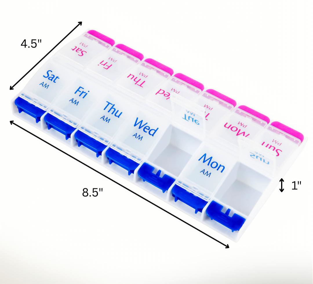 This compact 7-day pill organizer makes it easy to stay on track with your daily medication routine. Each clearly labeled compartment is designed for AM and PM use, helping you organize pills for the entire week at a glance. The slim, lightweight design fits easily into bags, purses, or drawers, making it ideal for home use or travel. Durable snap-closure lids keep pills secure while still allowing quick, one-hand access whenever you need them.
