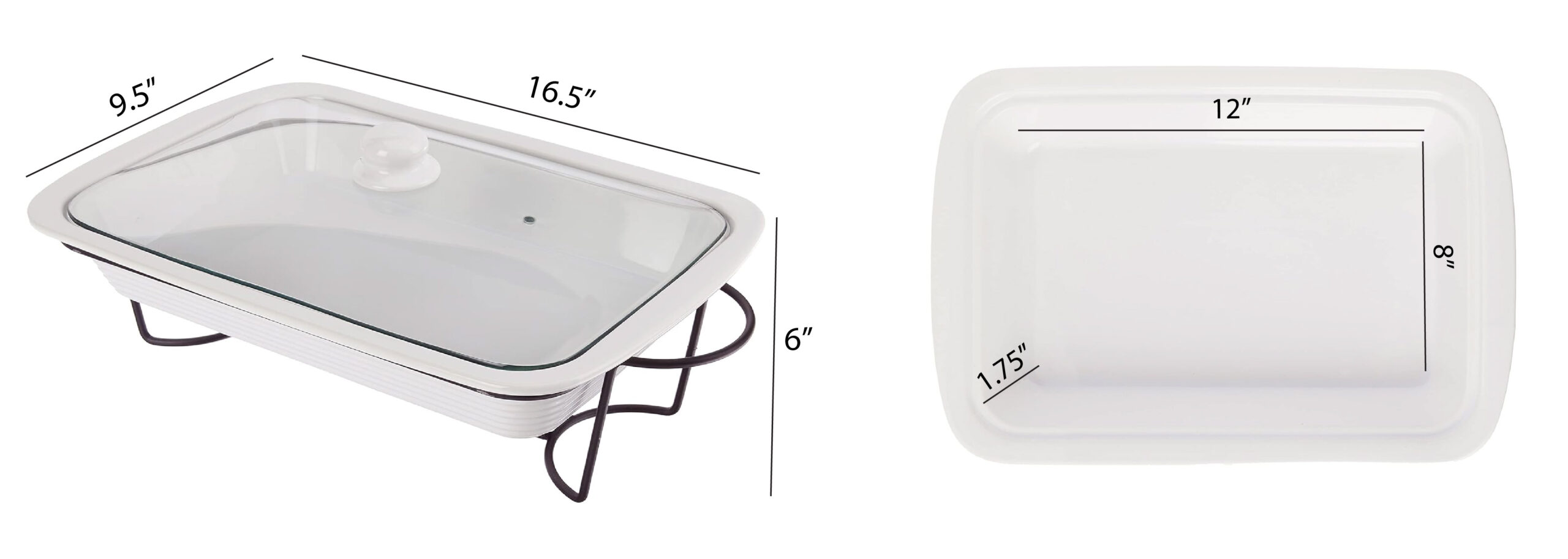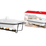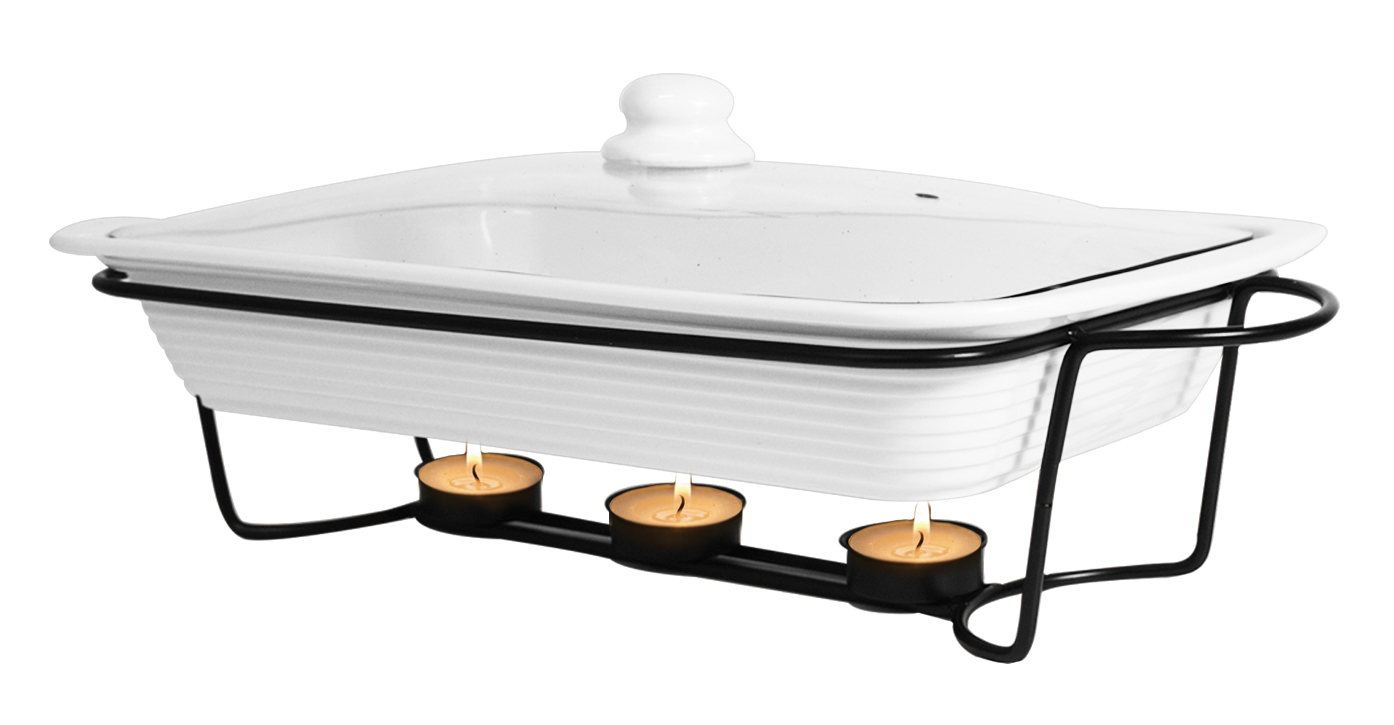 This versatile three-piece bake and serve food warmer set makes entertaining and everyday meals effortless. The rectangular ceramic dish holds up to 64 oz, making it ideal for casseroles, pasta, meats, and side dishes. Designed to go from oven to table, the dish rests on a sturdy metal stand that uses tealight candles to keep food warm while serving. With its clean, modern look and practical design, this set is oven, microwave, freezer, and dishwasher safe, making it a convenient and stylish addition to any kitchen or dining table.